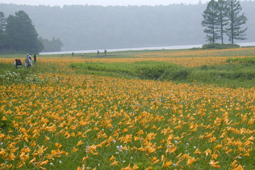 7月中旬、湿原はどこまでもオレンジ色の花に覆われます。
